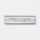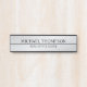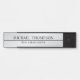 This door sign features name and title in black professional serif font style with black line in the middle on silver background.