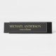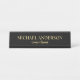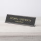 This desk name plate features name in gold professional serif font style and title in gold modern script font style on black background.