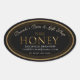 Black Oval Label has complex Gold Border with a series of subtle repeating concentric ovals along outer edge. "Pure Honey" in chiseled metallic gold font. Personalise with your Apiary Name in a curved elegant font across top of label. Location and Contact info highlighted in white. Choose net weight from pre-calculated list of common sizes from form field.