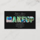 The perfect visiting card for professional make-up businesses with peacock feather coloured letters showing elegant feather structures with the word MAKEUP on black background.