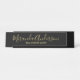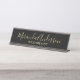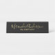 This desk name plate features name in modern script font style and title in gold modern sans serif font style on black background.