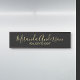 This hanging name plate features name in modern script font style and title in gold modern sans serif font style on black background.
