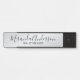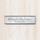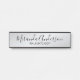 This door sign features name in black modern script font style and title in black modern sans serif font style on silver background.