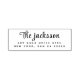 Modern return address stamp featuring your name in a stylish script and your address in simple typography. Save time and effort by effortlessly personalising your return address. Perfect for wedding invitations, party announcements, everyday correspondence and business mailings.