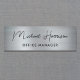 Professional name tag with your name in a modern script and title in simple typography on a brushed silver faux metal background.