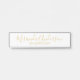 This hanging name plate features name in modern script font style and title in gold modern sans serif font style on white background.