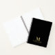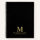 Professional notebook features custom monogram, name and text in gold classic serif font style on black background.