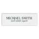 This name tag features name in black professional serif font style and title in black classic script font style on white background.
