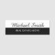 This name tag features name in black classic script font style and title in black professional serif font style on white background.