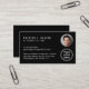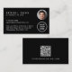 Simple black professional business card featuring your photo showcased in a circle frame, your company logo and your name, title and contact information (such as email, telephone numbers, firm name and mailing address) in clean, modern white lettering. On the back, input a URL address to create a scannable QR code linked to your website, social media profiles, or any other platform that showcases your work, making it easy for others to explore your expertise, and add additional text or leave blank.