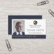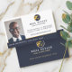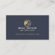 Modern and professional real estate business card design with a photo placeholder incorporated into the design to display your own photo portrait. Clean, minimal layout design with stylish navy and gold real estate house logo that you can personalise with your business name or remove and replace with your own logo. Name and title are displayed prominently along the bottom within a navy blue stripe. Subtle faux gold accents are incorporated into the design to add an elegant professional look. Personalise with your contact information. The reverse side features company logo and additonal contact information, such as website address. You can change the background colour, font, font colour and layout to suit your personal preference. Logo design contained in this design are original artwork by moodthlogy.