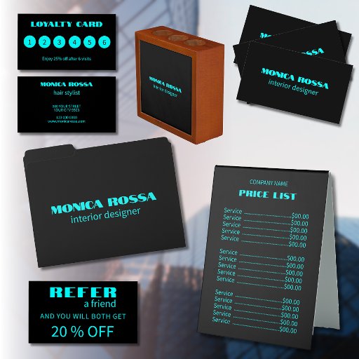Minimalist Clean Black Soli Colour Background and Neon Blue modern font Business Card. Personalise for your custom use.