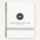Modern notebook features a simple black and white design with a stylised monogram medallion in black and white with modern typography, with custom name and title or role in a coordinating black typography on a white background with two complimentary black stripes to balance the overall design.