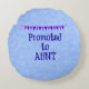 Promoted to Aunt celebration banner on blue bokeh background, round pillow.
