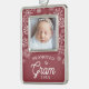 Celebrate his first Christmas as a grandmother with this sweet photo ornament featuring a baby photo framed by falling white snowflakes on a red background. "Promoted to Gram" appears beneath in white rustic lettering, along with the year.
