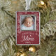 Celebrate his first Christmas as a grandmother with this sweet photo ornament featuring a baby photo framed by falling white snowflakes on a red background. "Promoted to Mima" appears beneath in white rustic lettering, along with the year.