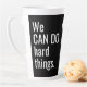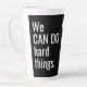 Promotional Latte Mug Business Logo No Minimum. We Can Do Hard Things Quote Business Logo Latte Mug. Stand out in a sea of coffee mugs with your tall latte mug! Personalised with your corporate company or small business or entreprenruial logo or for your team, sports team or nonprofit volunteer group. Modern white handlettering typography on black background. Perfect gift for your own teams or as a promotional marketing product or a gift for customers, clients or prospects. Inspirational quote on both sides. Your logo between them. Logo can be removed if you wish. Let them know your team CAN! Step by Step Inspiration Series available exclusively on Zazzle at zazzle.com/store/KrisHarty, designed by international designer, Kris Harty. © 2020 Kris Harty Step By Step Inspiration