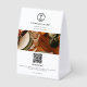 A promotional marketing paper table tent sign template featuring your custom photo, your business logo, text, QR Code and contact details. This minimalist paper table tent sign template is suitable for any business big or small. Customize this promotional paper table tent sign and make it your own!