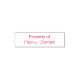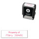 This self-inking stamp is a text template that you can edit to show a custom message. Currently, the top line of the display text says Property of. The bottom line is for the child's name (Shown: Property of Mary Jones). The name appears in a handwriting-style font.