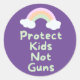 Round sticker with "Protect Kids Not Guns" text in mint green handwriting style font and pastel rainbow graphic on purple background.