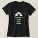 Women's tee with "Protect Kids Not Guns" text in mint green handwriting style font and pastel rainbow graphic on purple background.