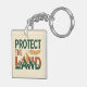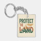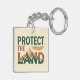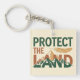 This bold, eco-conscious keychain features the phrase "PROTECT THE LAND" with the word "LAND" incorporating a striking mountain range illustration. The design uses a high-contrast colour palette of deep green, rust orange, and gold. A detailed, linework feather floats above the design, adding a powerful, indigenous-inspired element.