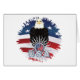 Proud American eagle is set in front of the stars and stripes of the American flag with silver USA text. This is a patriotic design you can be proud to wear.