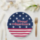 These patriotic paper plates are perfect for 4th of July parties, featuring white stars on a blue background on the upper part, and red and white stripes on the lower part. The caption in red modern font reads Proud American.