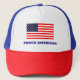 Show your patriotic spirit with this bold "Proud American" Trucker Hat, featuring a classic flag graphic.