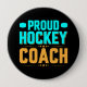 Hockey coach button with aqua blue and gold text reads Proud Hockey Coach.