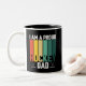 Proud Hockey Dad mug features several colours of green, off white, yellow, and rust orange on a black background with white text that reads I Am a Proud Hockey Dad!