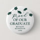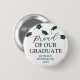 Green Graduation Button featuring falling mortarboard caps, the text "proud of our graduate", the grads name, and class year.