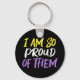 I am so proud of them keychain written in yellow, white, and purple on black for nonbinary parents. Show your pride for your non-binary child with the non binary colours for a mum or dad.