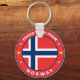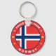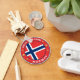 The national flag of Norway is infused into a circle shape. The outer circle has the colours of the flag and decorative stars, alongside the text stating a person`s pride in being born in Norway.