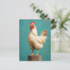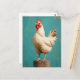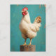 A charming rustic oil painting featuring a proud white chicken standing tall atop a weathered wooden stump. Set against a distressed turquoise background with hints of orange, this artwork radiates farmhouse charm and vintage character.