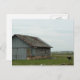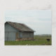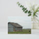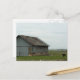 An old barn sits in the middle of a farm field, while a baby calf looks on. Postcard features bible verse Proverbs 16:8.