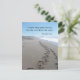 This postcards shows two sets of footprints making a path through the sand on a beach in California. It shows the Bible verse Proverbs 16:9 which says, "A man's heart plans his way, but the Lord directs his steps."