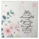 Inspirational quote scripture ceramic tile depicts a beautiful floral design with pink flowers and blue leaves. It features Bible Verse Proverbs 31:25, "She is clothed in strength and dignity and she laughs without fear of the future."