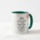 Inspirational quote scripture coffee mug depicts a beautiful floral design with pink flowers and blue leaves. It features Bible Verse Proverbs 31:25, "She is clothed with strength and dignity and she laughs without fear of the future." _