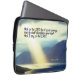 Laptop sleeve with inspirational quote scripture depicts a beautiful nature photograph of the sun shining through the clouds over the water, with blue skies and dark mountains in the background. It features an encouraging Bible Verse Psalm 27:14, "Wait on the LORD; Be of good courage, And He shall strengthen your heart; Wait, I say, on the LORD!"