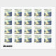 Square sticker with inspirational quote scripture depicts a beautiful nature photograph of the sun shining through the clouds over the water, with blue skies and dark mountains in the background. It features an encouraging Bible Verse Psalm 27:14, "Wait on the LORD; Be of good courage, And He shall strengthen your heart; Wait, I say, on the LORD!"