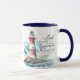 Coffee, tea mug with inspirational quote scripture depicts a red and white lighthouse on a rocky ocean coastline. It features a powerful and encouraging Bible Verse Psalm 27:1, "The LORD is my light and my salvation; Whom shall I fear? The LORD is the strength of my life; Of whom shall I be afraid?"