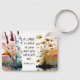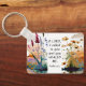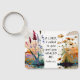 Keychain with inspirational quote scripture depicts a beautiful nature watercolor including earth tone shades of wildflowers on a woodland pond and a sunset background. It features an encouraging healing Bible Verse Psalm 30 2, "O Lord, I cried to You and You healed me."