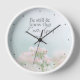 Wall clock with inspirational quote scripture depicts a simple botanical garden with pretty pink flowers and a soft blue background. It features Bible Verse Psalm 46:10, "Be still and know that I am God."