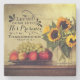 Inspirational quote stone coaster depicts a beautiful still life with a vase of sunflowers and bowl of fruit. It features a portion of Bible Verse Psalm 95:2, "Let us come into his presence with thanksgiving."