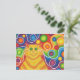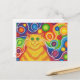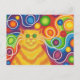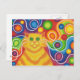 Groovy baby! A yellow and orange striped cat with swirling whiskers and a psychedelic rainbow patterned background. Postcaerd with a yellow, orange, red, blue, green, pink, purple, and white customisable design for you to personalise with your own text, images and ideas.An original digitally enhanced coloured pencil drawing by Jess Perry.