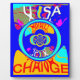 The design is dominated by a bold royal blue background, framed with striking yellow/gold borders. The centre features a kaleidoscopic arrangement of circles and patterns in cyan, red, yellow, and magenta, creating a mesmerising, energetic focal point. Large, stylised text fragments add to the urban, graffiti-like texture of the piece. This piece is a perfect statement for anyone who loves pop art, abstract design, and bold, contrasting colours.