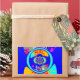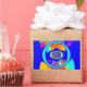 The design is dominated by a bold royal blue background, framed with striking yellow/gold borders. The centre features a kaleidoscopic arrangement of circles and patterns in cyan, red, yellow, and magenta, creating a mesmerising, energetic focal point. Large, stylised text fragments add to the urban, graffiti-like texture of the piece. This piece is a perfect statement for anyone who loves pop art, abstract design, and bold, contrasting colours.