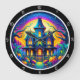 This mesmerising illustration depicts a stylised haunted castle under a full moon with a colourful halo. The tall, blue building with glowing windows is surrounded by glowing pumpkins and surreal foliage. The vibrant, psychedelic colours and twisted trees create a magical and spooky atmosphere within the circular frame.