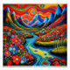 A.I. created print of a vivid psychedelic landscape teeming with colourful flowers and flowing river contrasts sharply against dramatic, blue mountain peaks under a sky of swirling clouds.